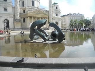 Today's blog is about two places to visit in Vienna. First the Belvidere Palace and secondly the Church of St Charles. Once you go behind the modest entrance off a regular traffic street you are amazed at a vast lawn and garden. The space is landscaped with high hedges, and statues, and fountains, and sculptures. One is overwhelmed at the largeness of it all. And this was the summer home of Eugene of Savoy. The building was started about 1700. The second place to visit is Karlskirche or the Church of St Charles. Here too one is amazed by size and the intense art that covers every corner of it. What a contrast the modern art sculpture makes just outside in the reflection pool. Next time we'll attend a concert and visit the Cathedral of St Stephan.